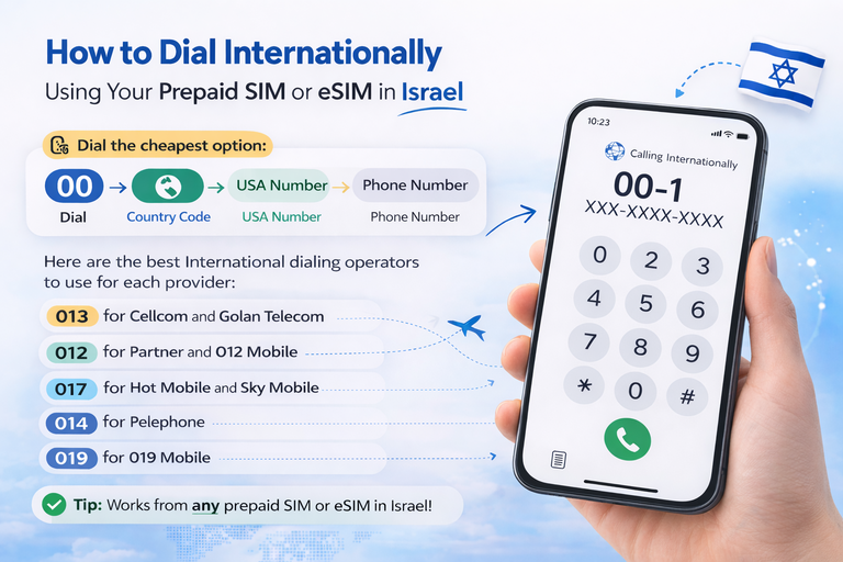 We found the cheapest solution for you to call internationally when you pay as you go, With Partner dial 012 with all other providers dial 013 , if you add credit with Netvision the rate is only 5¢ per minute